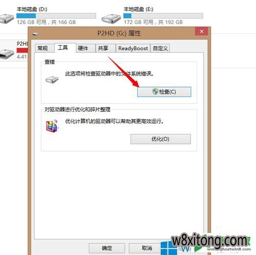 3、在弹出的对话框选择“工具”选项卡,并选择“查错”旁边的“检查”按钮。