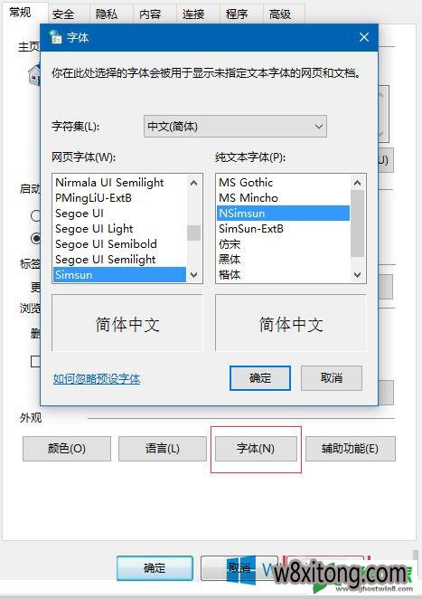 2、在internet属性界面中,点击外观下面的“字体(n)”,修改下文字;
