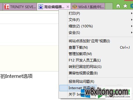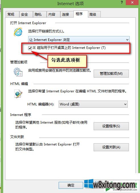 很多用户都喜欢在电脑上安装win8系统,但是有时候可能会遇到win8系统开始菜单里面的iE浏览器打不开的情况。最近有不少用户到本站咨询win8系统开始菜单里面的iE浏览器打不开的问题该怎么处理?虽然解决方法很简单,但是大部分用户不清楚win8系统开始菜单里面的iE浏览器打不开到底要如何搞定?其实步骤很简单,只需要1、打开桌面上的iE浏览器,选择iE工具菜单栏下的internet选项 2、然后切换到程序页面,勾选iE磁贴用于打开桌面上的internet Explorer(T);就ok了。本教程就给大家演示一下win8系统开始菜单里面的iE浏览器打不开详细的解决步骤: