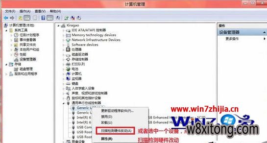 7、或者选择一个设备,打开右键--选中“扫描检查硬件改动”;