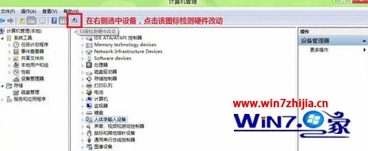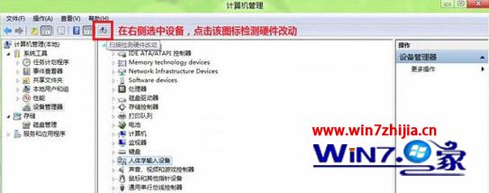 5、点击设备管理器,右侧选择设备,就可以打开工具栏上的“扫描检查硬件改动”进行操作;