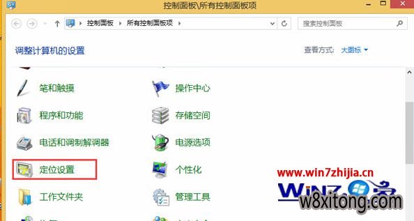 2、 在控制面板中,查看方式改为“大图片”选中“定位设置”并点击。