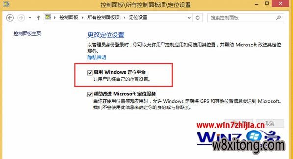 3、 在更改定位设置中,勾选“启用 windows 位置平台”;