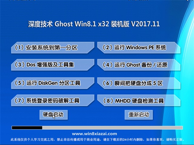 深度技术Win8.1x32位装机版系统仅用于进行演示基于万能GHOST的快速部署技术,供装机维护技术人员参考,我们不承担任何技术及版权问题,且不对任何资源负法律责任。所有资源请在下载后24小时内删除。如果您觉得满意,请购买正版 !!!