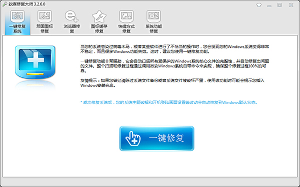 魔方修复大师具系统修复、浏览器修复、图标修复、快捷方式修复、顽固图标修复以及系统功能修复,修复成功后均为系统默认状态。 魔方修复大师的特色 1.一键系统修复 2.顽固图标修复 .....