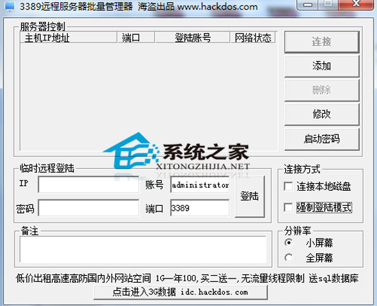 3389远程服务器批量管理器,是一款免费软件,无需安装,绿色无毒 本软件采用高级加密算法,所保存的服务器数据不会被人破解 操作简洁方便,适合服务器管理员,网站站长使用.....