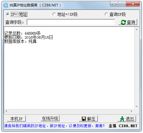 纯真ip地址数据库 收集了包括中国电信、中国网通、长城宽带、网通宽带、聚友宽带等 isp 的最新准确 ip 地址数据。包括最全的网吧数据。希望能够通过大家的共同努力打造一个没有未知.....