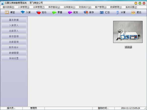 思飞仪器仪表销售管理是一款简便,易用的进销存销售管理软件,界面清晰, 操作快捷,方便实用等特点。集新进货品管理和销售,旧货品 的退换和返厂管理,打印报表,货品定价,采购定单,数据导 出等多项实用功能。 系统基本数据模块: 公司数据,员工数据录入。 客户基本数据模块: 供货商,经销商数据录入。 新进货品数据模块: 新金货品入库和定价管理。 退换货品数据模块: 客户退换货品管理和返厂。 库存管理数据模块: 货品库存查询和采购计划。 货品销售管理模块: 货品零售,批发录入管理。