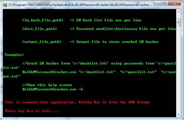 BulkLM哈希密码破解是一个简单的命令行工具快速大规模LM哈希密码破解。软件可以把整个转储LM哈希(每行一个)到文本文件中,然后开始破解使用密码字典/词库文件。每个密码字典文件是与所提供的一系列散列和破解密码散列将被写入输出文件。它还负责复制密码散列自动所以你不必执行任何pre-sorting工作。在散列裂化操作的详细统计数据显示密码完成计数和显示了散列的数量。此工具用于渗透测试人员和研究人员转储LM哈希密码。