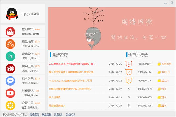 阁楼营销资源宝盒是一款免费的资源分享型软件,汇集了网上的各种资源,包括软件,教程,办公素材,最新影视等。其中以营销资源为主,都有详细的简介,界面截图,并提供网盘链接,一.....
