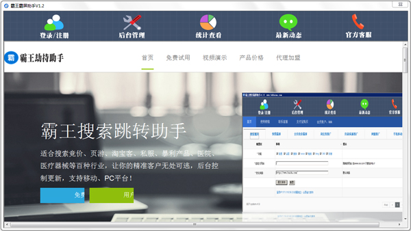 霸王霸屏助手是一款非常不错的营销软件。该软件支持各大搜索引擎,支持自定义跳转,能够有效提高转化率,让你的流量瞬间提高! 功能特点: 搜索跳转 支持各大搜索引擎,使从任意方.....