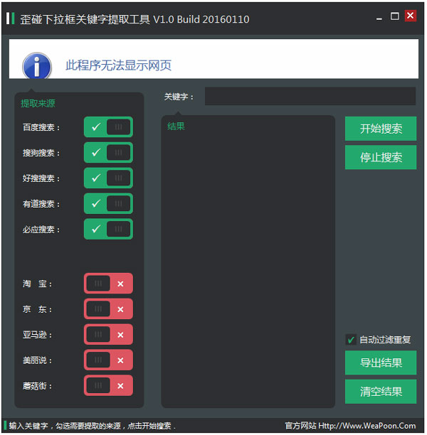 歪碰下拉框关键字提取工具是一款功能强大的seo关键词提取工具。该软件支持提取搜索引擎和购物网站等搜索建议关键字,很适合做seo的用户! 功能特点: 一、包含多种搜索引擎提取 二、.....