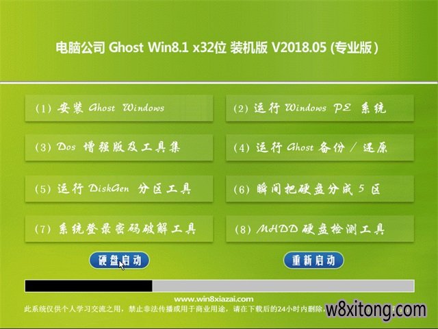 电脑公司Win8.1x32位装机版2018年5月版本仅用于进行演示基于万能GHOST的快速部署技术,供装机维护技术人员参考,我们不承担任何技术及版权问题,且不对任何资源负法律责任。所有资源请在下载后24小时内删除。如果您觉得满意,请购买正版 !!!