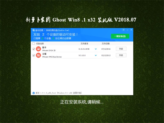 新萝卜家园Ghost Win8.1x32位装机版2018年7月版本后台自动判断和执行清理目标机器残留的病毒信息,以杜绝病毒残留,集成了最新流行的各种硬件驱动,新萝卜家园Win8.1x32位装机版2018年7月版本首次进入系统即全部硬件已安装完毕,我的电脑右键加入了设备管理器、服务、控制面板、方便大家使用。新萝卜家园Win8.1x32位装机版系统经过优化,启动服务经过仔细筛选,确保优化的同时保证系统的稳定,内存消耗低。新萝卜家园Win8.1x32位系统自动无人值守安装,采用万能GHOST技术,安装系统过程只需5-8分钟,适合新旧各种机型,集成装机人员常用工具,以方便日常维护。