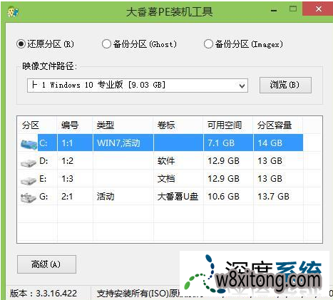 进入pe系统以后,此时pe装机工具自动跳出窗口,萝卜家园,咱们打开浏览,选中放在u盘内的深度win8系统镜像安装包,然后在工具磁盘列表中打开活动磁盘当做系统盘(除却u盘),然后选中“确定”