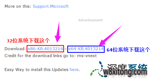 在下载页面中,总共有两个下载链接,一个是32位的补丁,另一个是64位的补丁,请依据自己的系统情况选中其中一个下载。