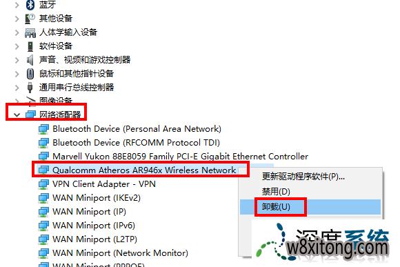 找到无线网卡(wireless,表示无线),右键无线网卡,选中“卸载”便可卸载驱动程序