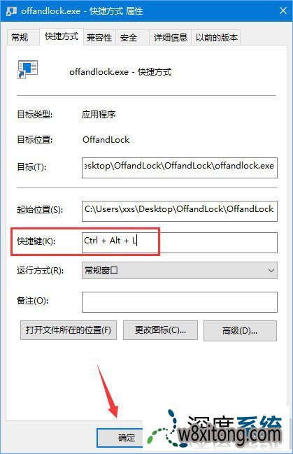 4、然后在快捷方式上点右键,选中“属性”打开属性窗口,萝卜家园,在“快捷键”写入框中点一下,然后同时按下你想要设置的键盘快捷键,确定,这样以后只需按你设置好的快捷键便可锁定并关闭屏幕了。