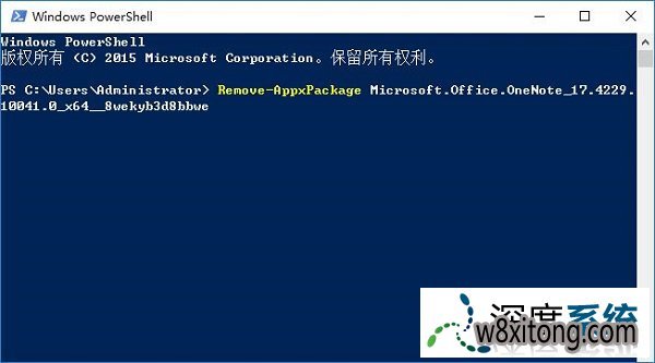 3、咱们在键盘上键入Remove-Appxpackage Microsoft.office.onenote_17.4229.10041.0_x64__8wekyb3d8bbwe,并且按下键盘Enter键,等待系统提示部署成功后,咱们就关闭powershell。