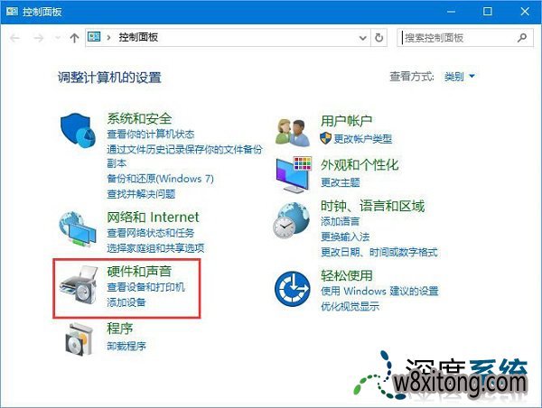 3、所以进入控制面板,选中硬件和声音。