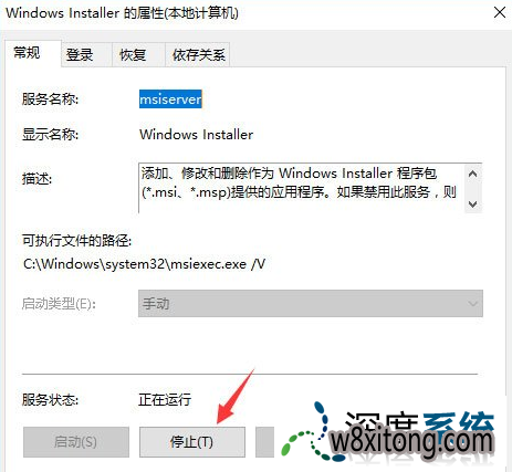 在界面中间的“服务”程序中找到“windows installer”项,右键呼出菜单,选中“属性”,打开“停止”。