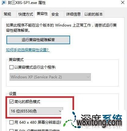4、接着切换到兼容性选卡,修改快捷方式文件,使其16色(65535)运行如下图所示: