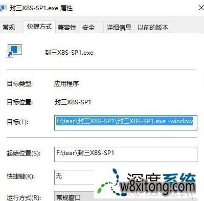 3、在快捷方式中,填加窗口化参数 在目标的exe后面加上 空格-window ;