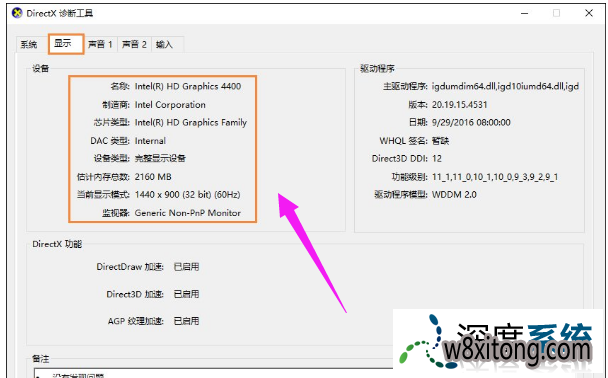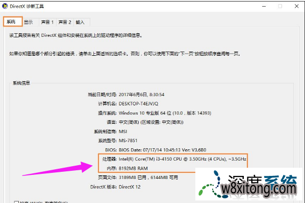 在directx诊断工具的“系统”和“显示”栏目可以看到咱们所要的电脑配置情况