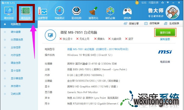 首先安装并打开鲁大师,萝卜家园,以后打开“硬件检查”一栏,初次加载会比较慢,稍等片刻便可,感觉不准可以在右上角“重头扫描”一次。