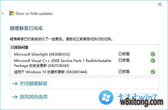 2、勾选需要隐藏的补丁,等待show or Hide Updates强制关闭windows更新。
