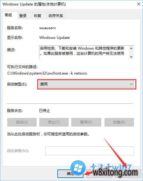 3、运行写入services.msc打开服务,找到windows Update,设置启动类型为禁止,确定。