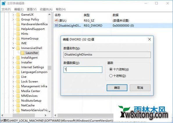 3、依次展开HKEY_LoCAL_MACHinE\soFTwARE\Microsoft\windows\CurrentVersion\immersiveshell\Launcher,右侧新建dwoRd(32位)值,命名为disableLightdismiss,设置数值数据为1,重启电脑。