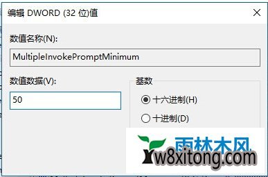 2、win8右键菜单无打印或者编辑怎样办?右侧新建dwoRd(32位)值,命名为MultipleinvokepromptMinimum,双击设置数值数据为50。