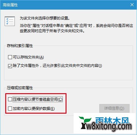 2、找到并取消勾选压缩内容以便节省磁盘空间和加密内容以便保护数据,确定。