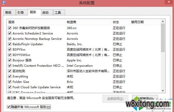 通过win+R运行MsConFiG,切换到“服务”选项卡,选择“隐藏所有Microsoft系统服务”,然后逐一禁用所有外来服务,禁用所有启动项,看问题是否得到解决。