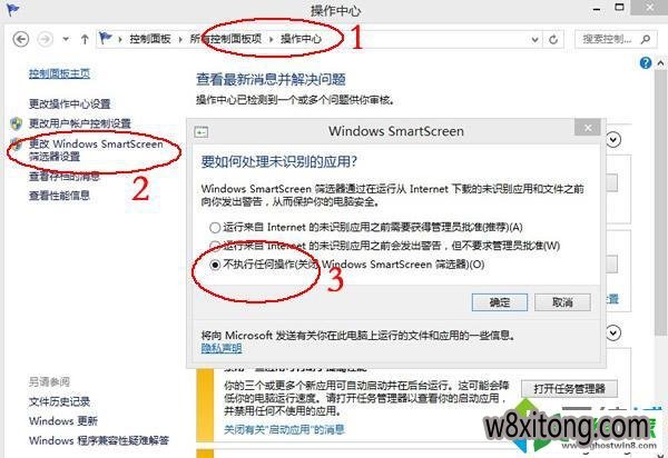 2、当然您也可以关闭smartscreen,方法是:按win+x组合键---控制面板---操作中心---更改windows smartscreen筛选器设置---不执行任何操作---确定。如下图: