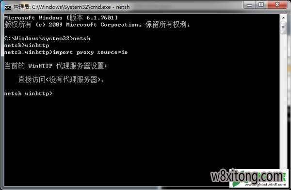 最后输入 import proxy source=ie 回车,出现提示:直接访问《没有代理服务器》。