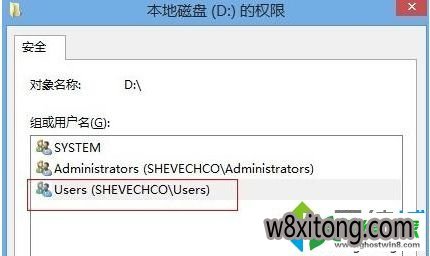 二、接着在ghost win8系统纯净版本地磁盘权限窗口上,选择“UsERs”,然后点击“添加”按钮,将权限写入,再点击确定按钮。