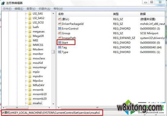 2.打开win8.1系统注册表编辑器,依次打开注册表,找到HKEY_LoCAL_MACHinE\system\CurrentControlset\services\Msahci下的 start 。如下图所示
