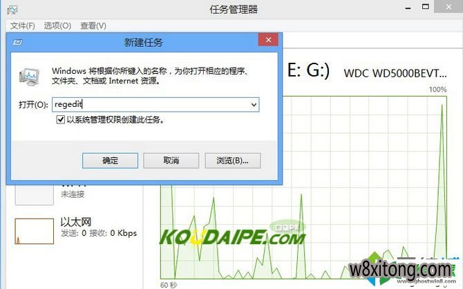1、在win8任务栏鼠标右键选择“任务管理器”,在“新建任务”中输入“regedit”点击确定;