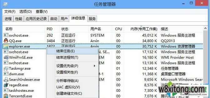 4、选择“explorer.exe”右键选择结束任务;