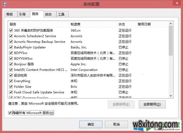 通过win+R运行MsConFiG,切换到“服务”选项卡,选择“隐藏所有Microsoft系统服务”,然后逐一禁用所有外来服务,禁用所有启动项,看问题是否得到解决