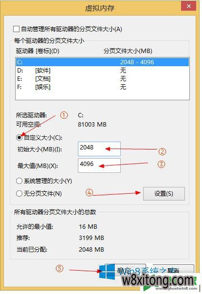 4、勾选自定义大小,设置初始大小和最大值,一般都设为2048~4096MB,确定。