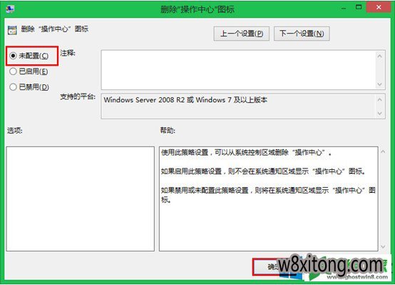 2、弹出选项设置对话框,将其设置为“未配置”或“已禁用”,点击“确定”按钮保存,退出组策略即可恢复任务栏操作中心图标。