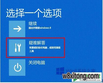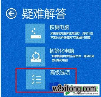 4、你将看到恢复界面,选择“高级恢复选项”---“疑难解答”如下图所示: