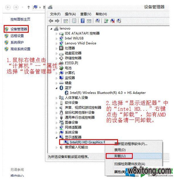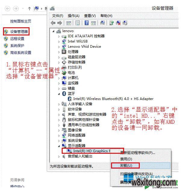 1、在升级win8.1系统之前,先在设备管理器卸载 intel 和 AMd 的显示卡驱动程序。如下图: