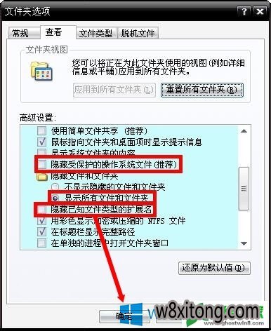 (3)、去掉隐藏受保护的操作系统文件、隐藏已知文件类型的扩展名前的对勾→确定。