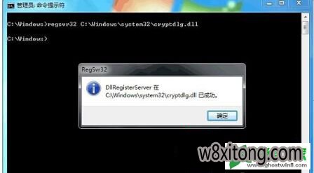 5、在命令提示符中输入:REGsVR32 C:\\windows\\system32\\CRYpTdLG.dLL 然后回车,对系统关键dLL进行注册;