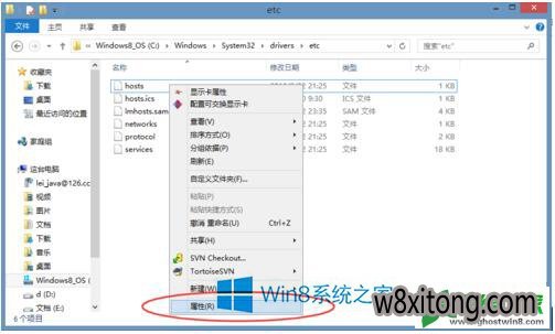 很多用户都喜欢在电脑上安装win8系统,但是有时候可能会遇到win8系统Hosts文件修改后无法保存设置权限的情况。最近有不少用户到本站咨询win8系统Hosts文件修改后无法保存设置权限的问题该怎么处理?虽然解决方法很简单,但是大部分用户不清楚win8系统Hosts文件修改后无法保存设置权限到底要如何搞定?其实步骤很简单,只需要 1、首先进入Hosts文件所在的文件夹; 2、右键Hosts文件,弹出菜单,选择属性;就ok了。本教程就给大家演示一下win8系统Hosts文件修改后无法保存设置权限详细的解决步骤: