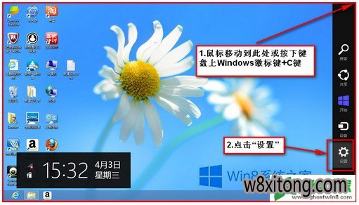 1、打开超级按钮,选择“设置”。可以通过鼠标移动到屏幕右上角打开超级按钮,也可以通过同时按键盘“windows徽标键”+“C”键 快速打开;